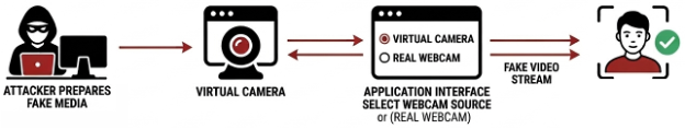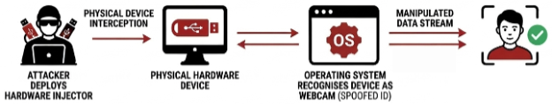 In this type of attack, the attacker manipulates the capture environment itself so that falsified media is treated as legitimate. One approach involves the use of virtual devices, where software‑based cameras or microphones emulate physical hardware. These virtual components can present attacker‑controlled images, videos, or audio streams directly to the verification system while appearing as standard capture devices.