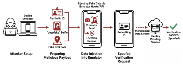 A third variant relies on device emulators, where the entire verification environment is simulated. Emulated devices can present falsified data while mimicking expected device characteristics, allowing attackers to test and refine injection techniques at scale.