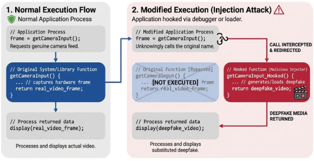 Rather than altering the device itself, some threat actors may instead target the verification path that handles the captured media. One technique involves function hooking, where application- or system‑level functions responsible for camera or microphone input are intercepted and modified. This allows attackers to replace genuine capture data with prerecorded or synthetic media at runtime.