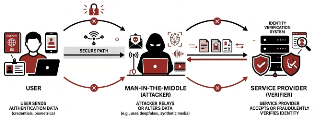 Another method relies on traffic interception, commonly described as a man‑in‑the‑middle (MiTM) scenario. In this case, media streams are intercepted and altered as they are transmitted between the client and backend services, enabling substitution without modifying the physical capture process.