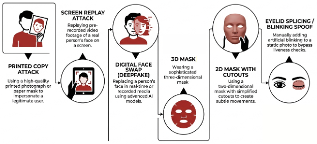 With this type of verification, fraudsters seek to impersonate a real person through Facial Spoofing, wherein a valid‑looking fake representation of the target is presented to the camera. This is typically carried out via:
