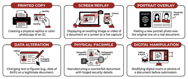 - Screen Replay – presenting a legitimate (stolen) or forged document via a digital screen.
