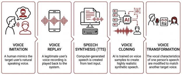 Speech Spoofing focuses on impersonating a target user by producing a voice output that matches the target’s “voice print/pattern” and speech behavior. Common methods are: