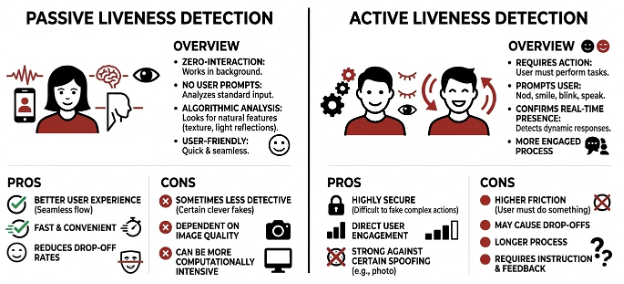 Liveness detection aims to prevent spoofing attacks by ensuring the user is live and physically or actively present at the time of the verification process rather than a recording or synthetic source. Liveness detection is implemented either passively or actively. With passive liveness detection, the verification system analyzes biometric signals without requiring explicit user interaction for a faster and seamless experience. As for active liveness detection, the system prompts users to perform actions such as head movements or speaking phrases to ensure users are actively/physically present during the verification process; however, it adds friction and inconvenience to some users.