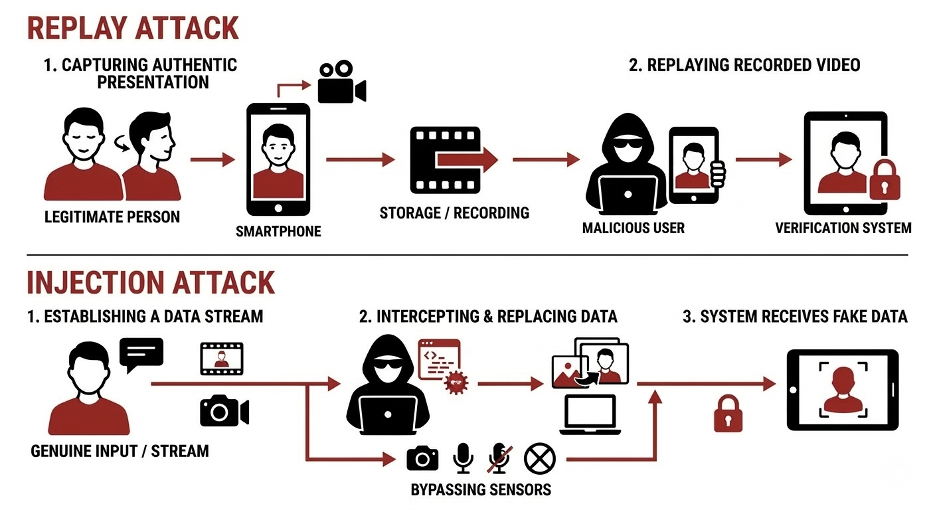 As liveness detection matured and spoofing/replay attacks became easier to detect, threat actors shifted toward more sophisticated techniques. This led to the rise of injection attacks, which target the verification pipeline instead of the sensor. Instead of fooling the sensors by presenting falsified media to a camera or microphone, injection attacks feed prerecorded, manipulated, or synthetic biometric data directly into the application or API. This makes the system believe the input is legitimate, since the injected data is a bit-for-bit replica of the source media and is of high quality.
